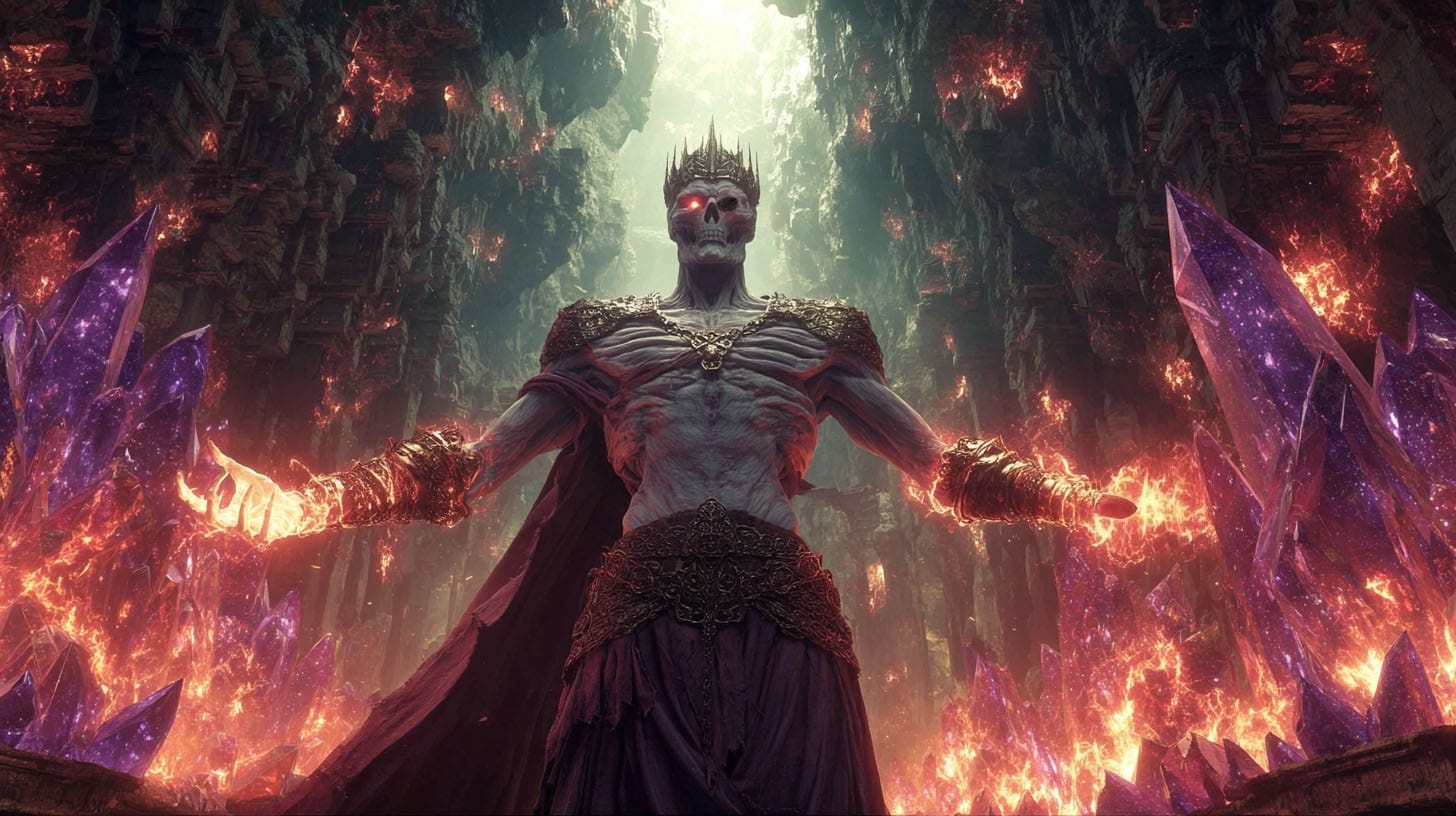 - They then face a set of diamond slab doors with eyes instead of handles; these also respond to touch, and the party teleports into a large, crystal-rimmed room where Vecna stands, looking upward, concentrating on a glowing orb of expanding energy in front of him.